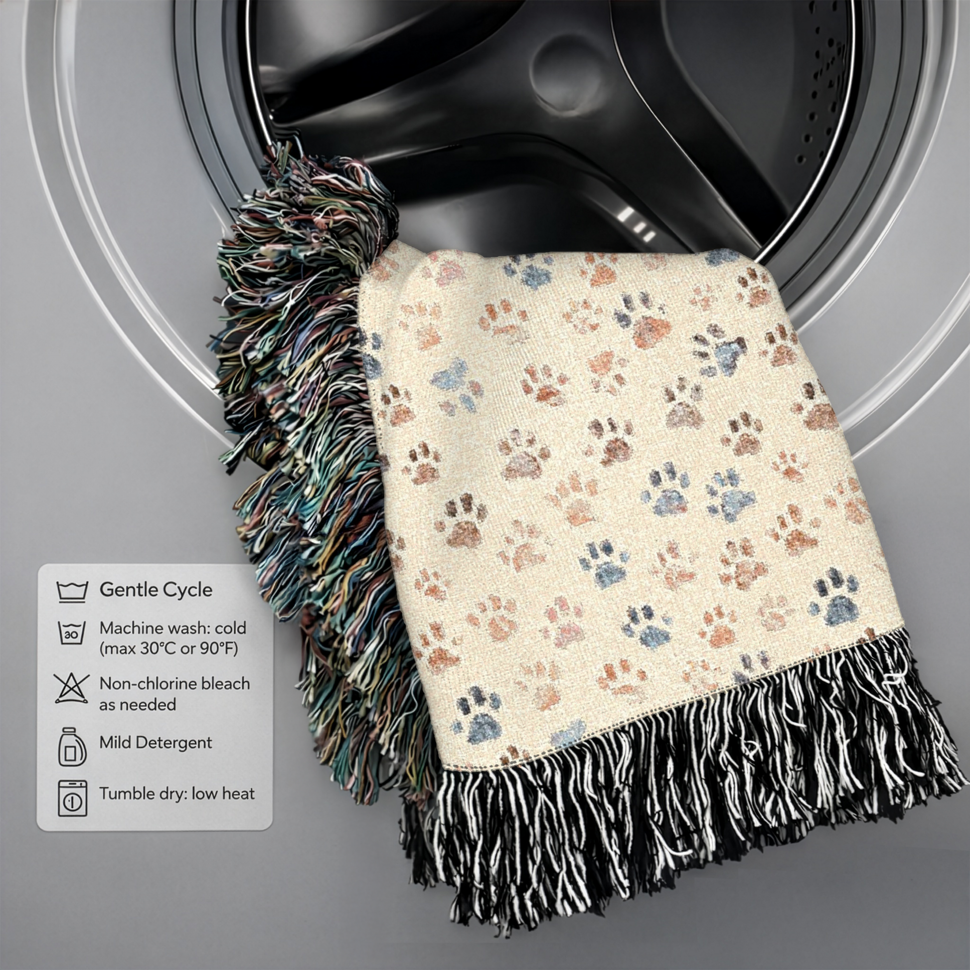 Woven (not printed) using 100% cotton yarn, each blanket features rich texture, detailed colour depth, and a classic fringed edge that frames your dog like a piece of art. The border features a subtle watercolour pawprint design, adding a soft decorative touch around your portrait.