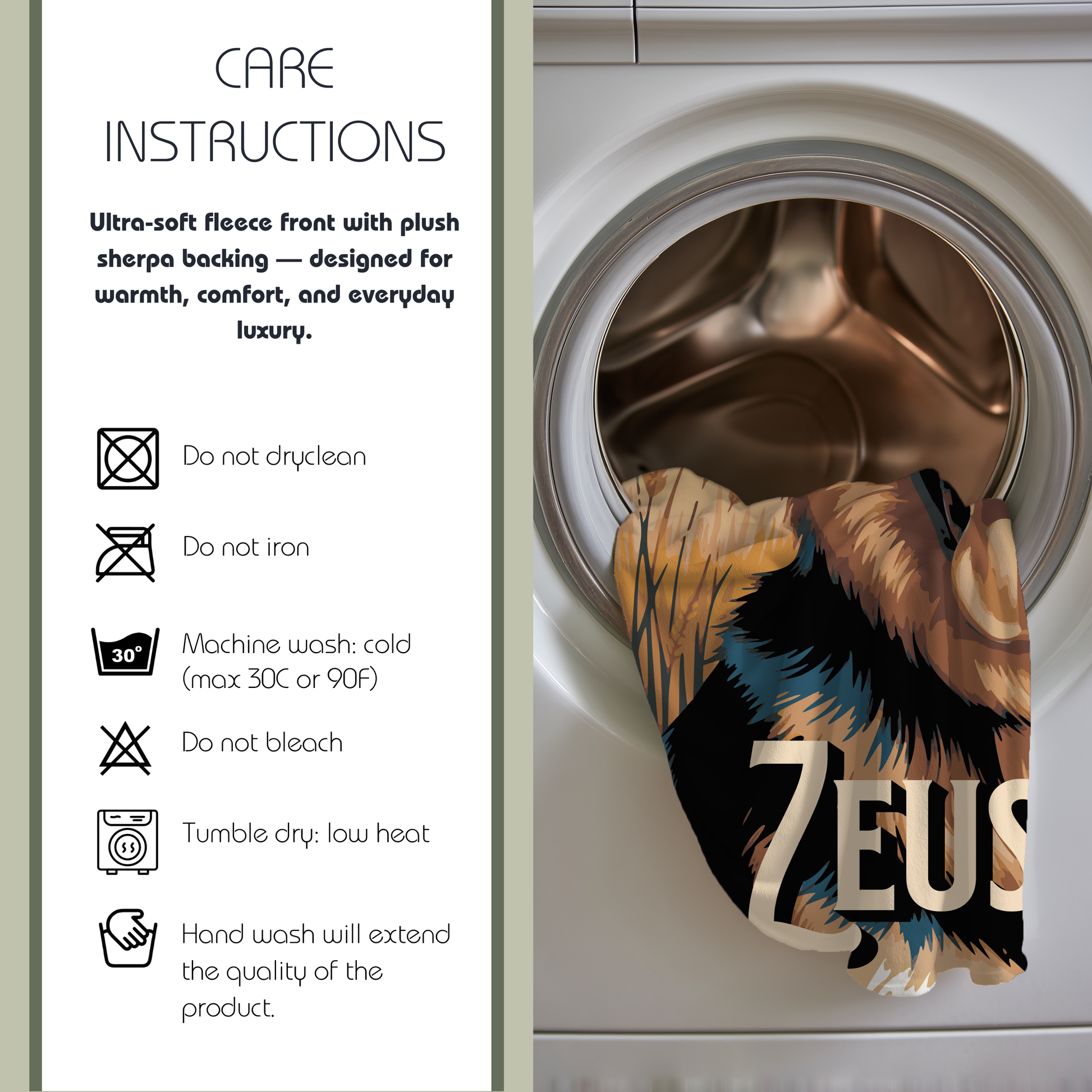 Care instructions: Do not dry clean, Do not iron, Tumble dry: low heat, Do not bleach, Machine wash: cold (max 30C or 90F), *hand wash will extend the quality of the product