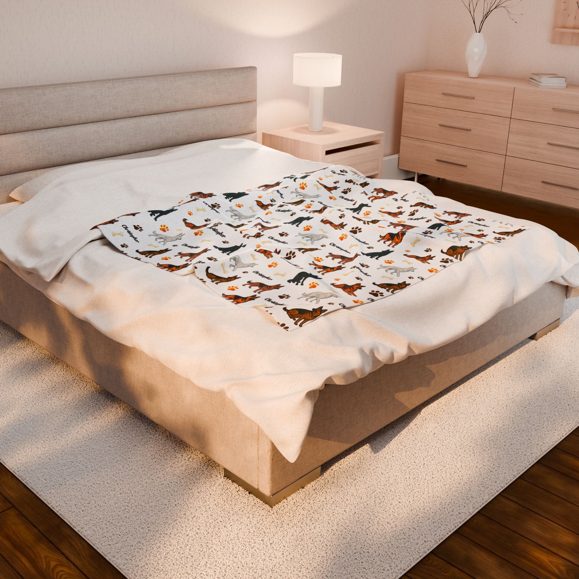 Soft, lightweight, and made for year-round comfort, our Playful Paws velveteen plush blanket wraps you in gentle warmth without the bulk. Featuring charming German Shepherd illustrations, paw prints, and your chosen name, it adds a touch of joy to every cuddle or nap.