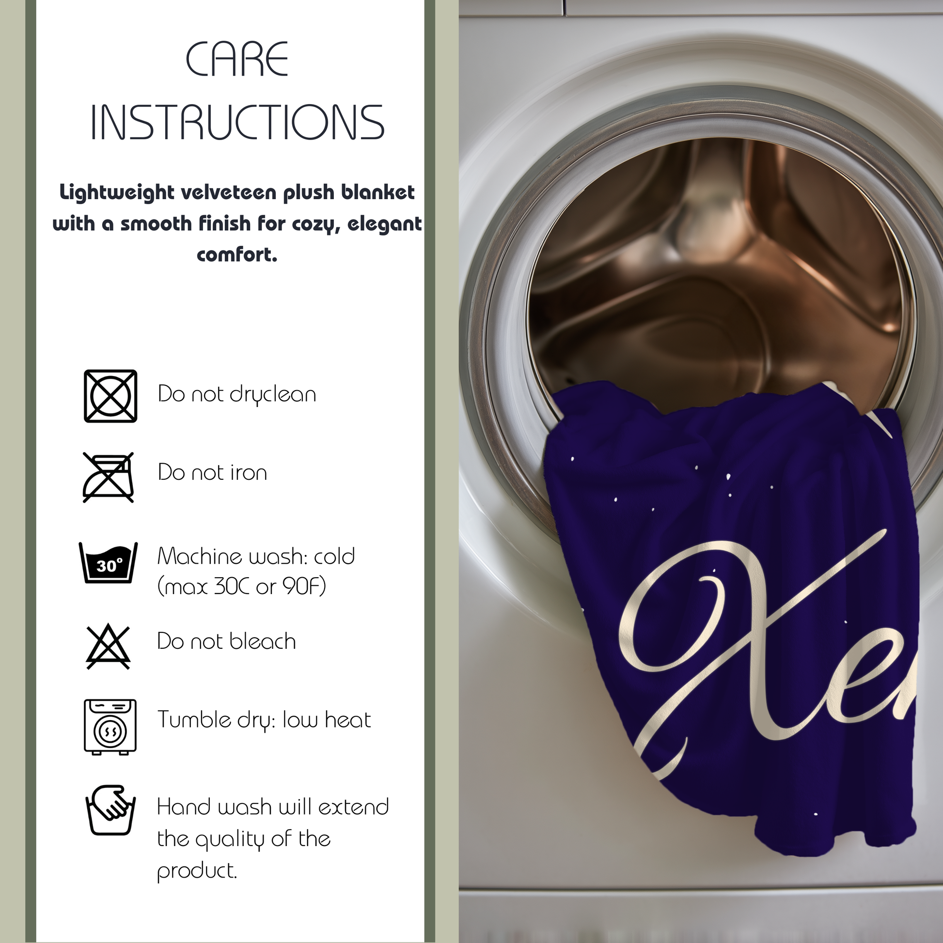 Care instructions: Do not dryclean, Do not iron, Tumble dry: low heat, Do not bleach, Machine wash: cold (max 30C or 90F), *hand wash will extend the quality of the product